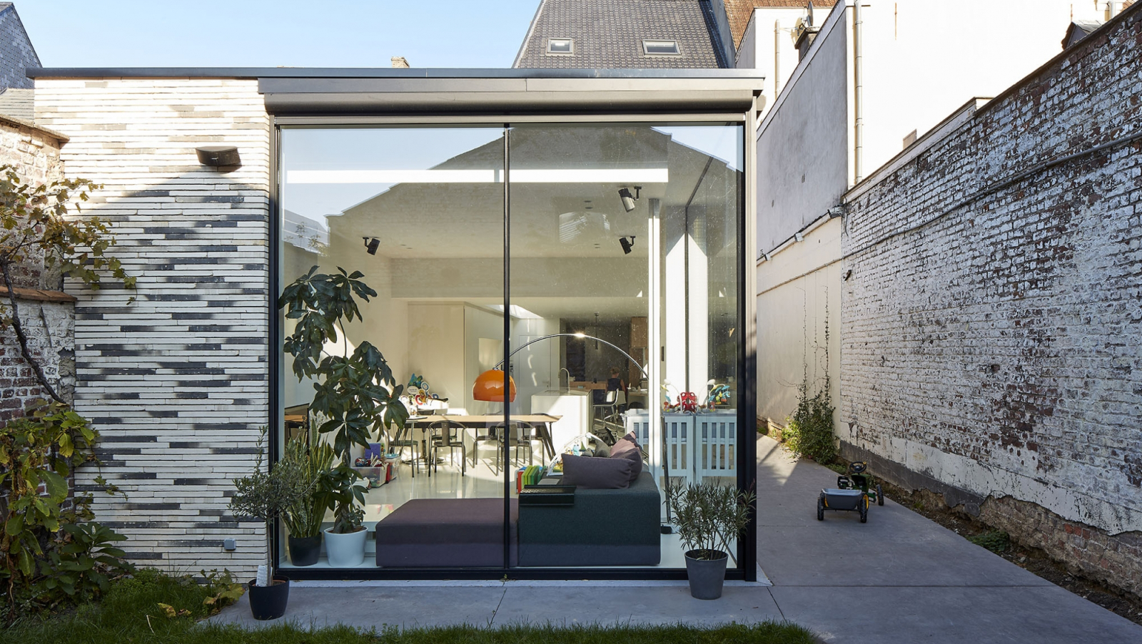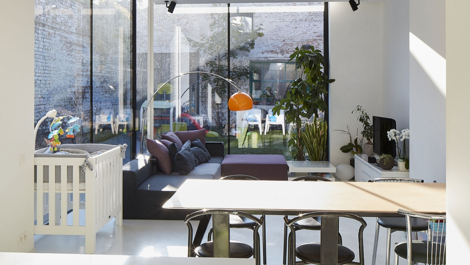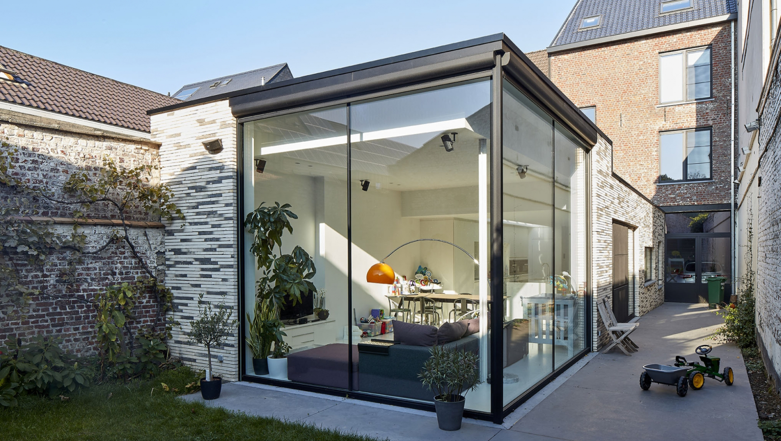 Deze stadswoning, die in de zeventiger jaren werd uitgebreid, kreeg een volledige make-over. De leefruimte baadt in het licht en kreeg een hechte relatie met de buitenruimte tussen de oude werkplaats en de woning.