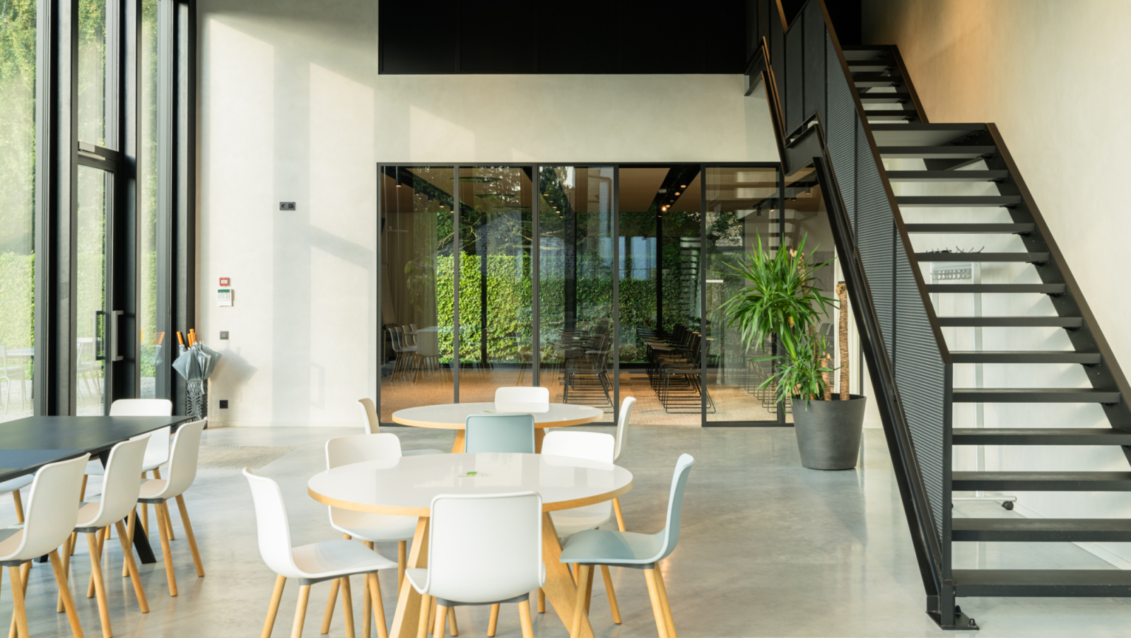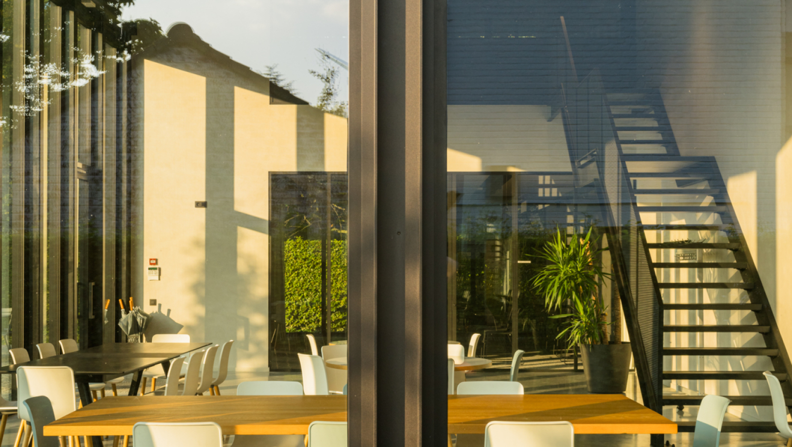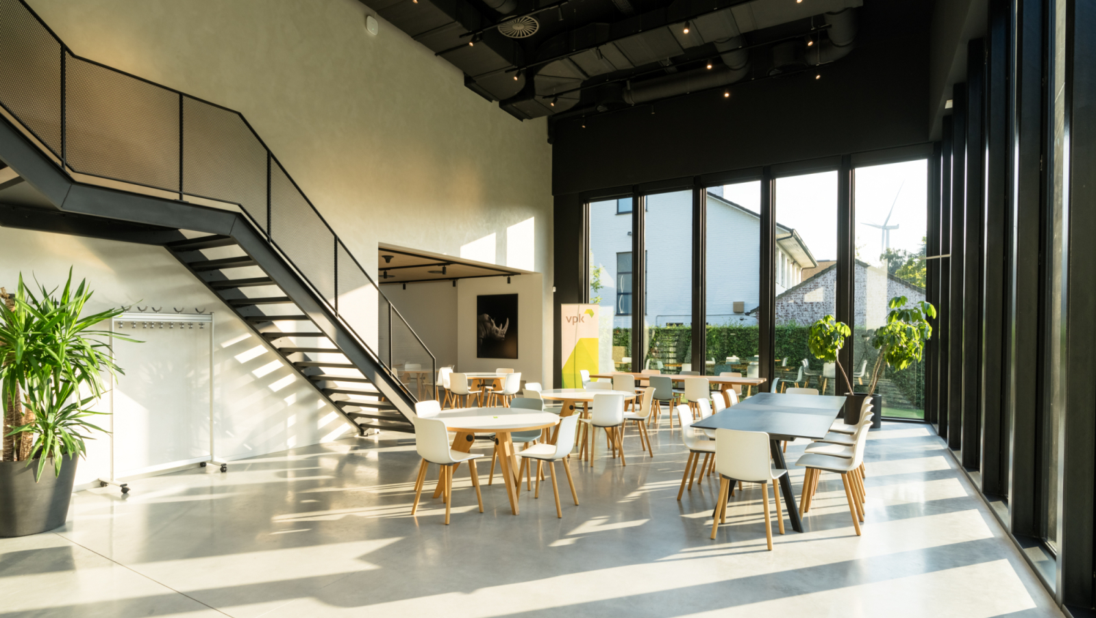 De strakke industriële look van het gebouw vormt samen met het cosy interieur een uitgelezen balans qua look & feel.